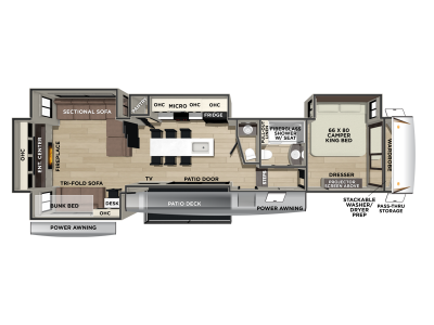 Each model is built durable with vacuum bond laminated sidewalls and a PVC roof membrane, and you'll love the look of the high gloss gel-coat front cap with LED lighting. You can create at-home meals with the fully equipped kitchen that includes Black Opal appliance accents, a spacious refrigerator, plus a workstation farm style sink. There are even more standard features to make you feel right at home, like the tankless water heater, adjustable stable steps, plus ambient accent lighting in the kitchen and living area.