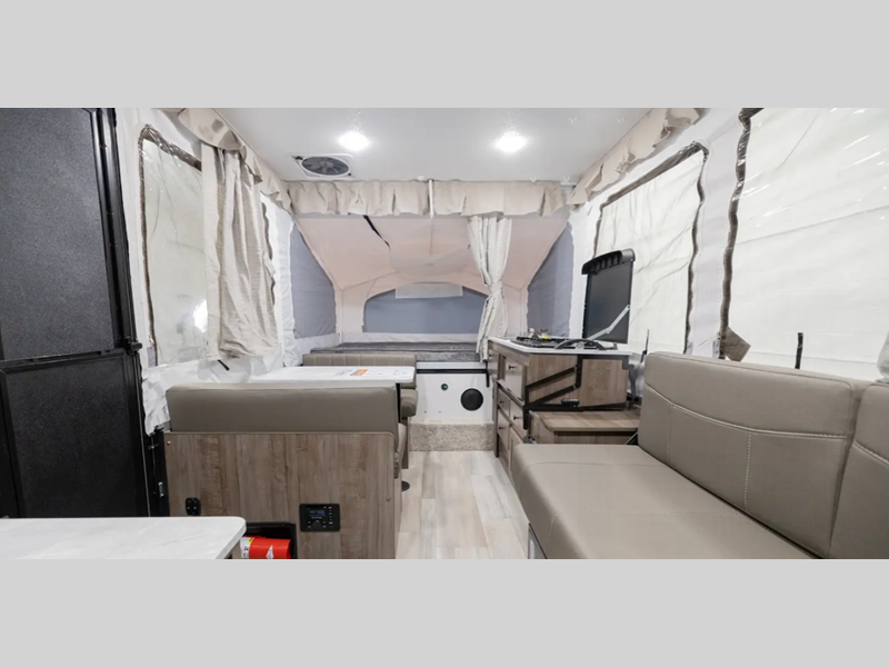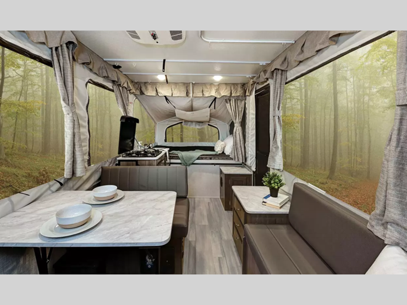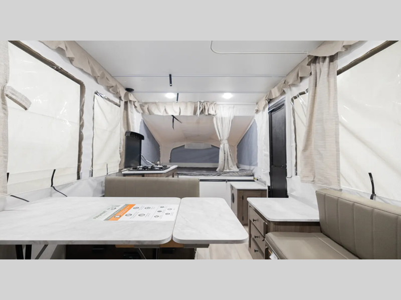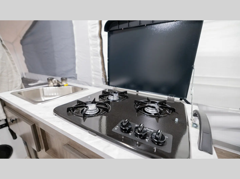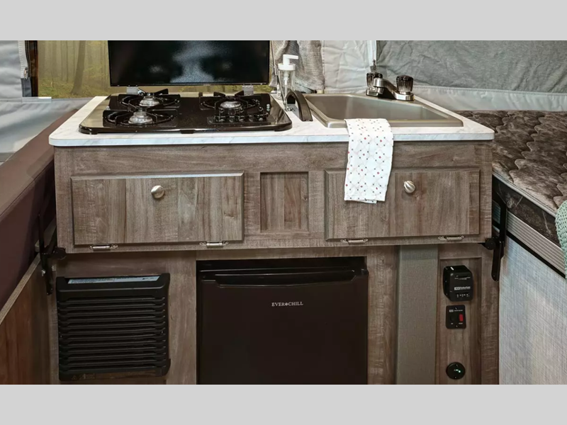 Sleeps 6 Length 14 ft 11 in Ext Width 7 ft Ext Height 5 ft 11 in Hitch Weight 268 lbs Dry Weight 2246 lbs Cargo Capacity 752 lbs Fresh Water Capacity 20 gals Tire Size 15" Furnace BTU 20000 btu Available Beds Two Tent End Beds Refrigerator Type 12V Refrigerator Size 1.7 cu ft Cooktop Burners 3 Number of Awnings 1 LP Tank Capacity 20 lbs Awning Info 8' 6" with LED Lights Axle Count 1 Number of LP Tanks 2 Electrical Service 30 amp Open Length 20 ft 1 in -
