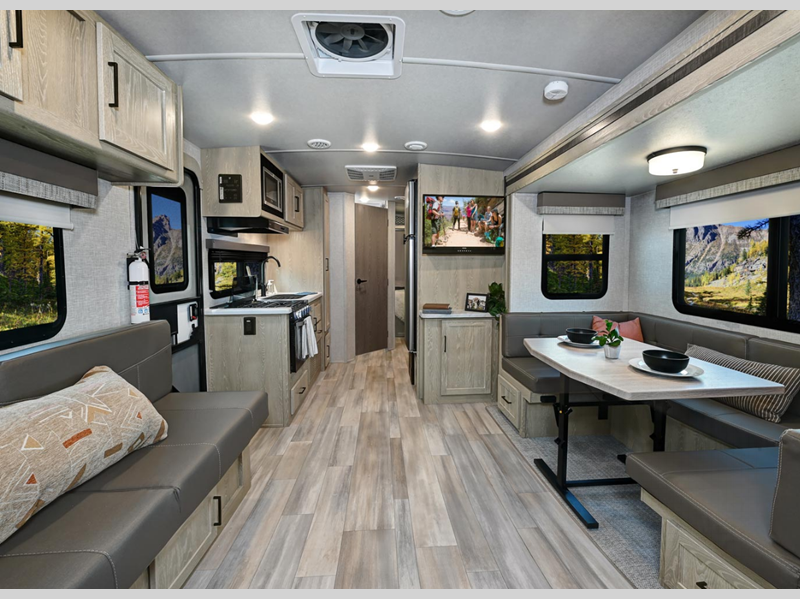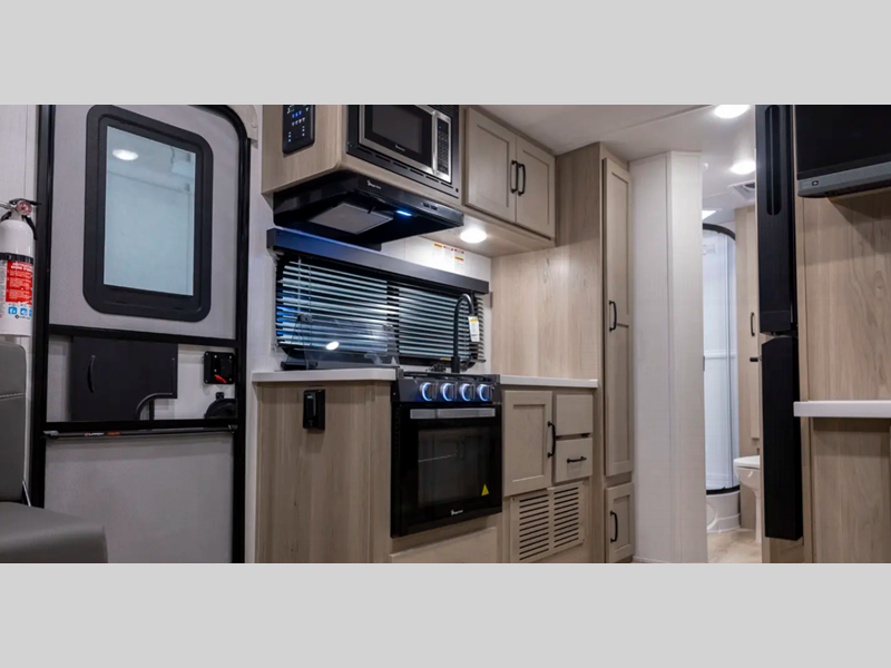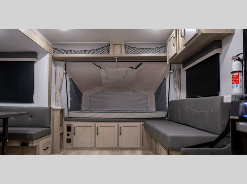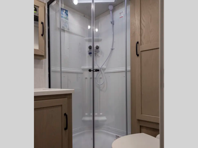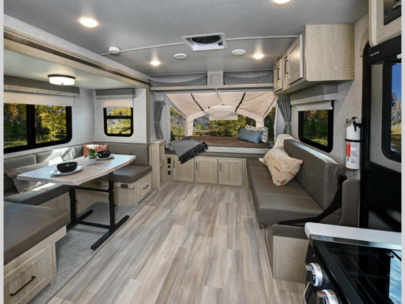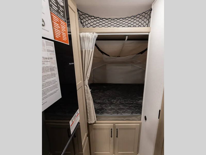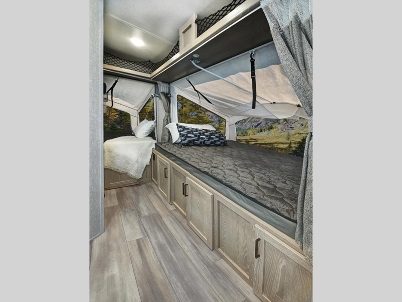 You will be able to make memories for years to come thanks to the durable construction materials, such as complete composite panels, 6-sided aluminum frame, and an enclosed underbelly. There are aircraft-grade cables that support the bed ends, and a bunk fan/light combo with each bed that will be super convenient when you're ready to relax for the night. These expandables also feature modern Sedona Wood cabinetry, night roller shades, seamless kitchen countertops, and a shower skylight to name a few more residential comforts.