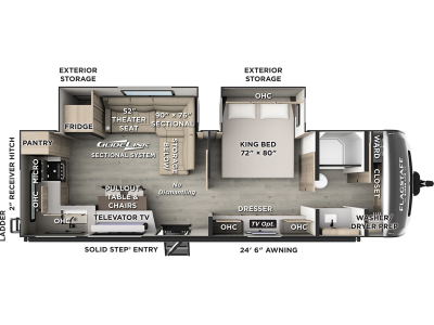 Each is built with 6-sided aluminum cage construction, a fully laminated walkable roof, and aluminum truss roof bracing for added support. You will love the standard features such as, a 200W solar panel, a Key-Alike lock system, and a Winegard Air 360+ prepped for Wi-Fi. The Coast to Coast Package includes amenities that will make you feel right at home including, solid surface kitchen countertops, roller shades, and soft close roller bearing drawers.