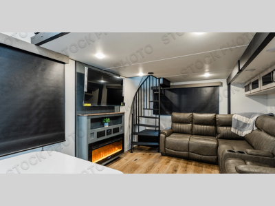 You won't believe the amount of comfort found in this destination trailer! There are two separate loft areas; one up front with a ladder, two bunk mats, a nightstand, cabinet, and bookshelf storage, and one in the back with steps, two bunk mats and a cabinet for storage! On the main level, you'll find your own space in the front private bedroom, complete with a king bed slide, a countertop, dresser, and even washer and dryer prep. And the full bath is right next to the bedroom for easy nighttime use. Head to the full kitchen to make meals on the four-burner stove, store food in the pantry and residential-style refrigerator and dine at the large kitchen island with four chairs. The rear living area will be a favorite hangout spot with its L-shaped sofa with recliners and an ottoman, along with an entertainment center with a smart TV and fireplace!