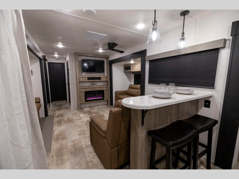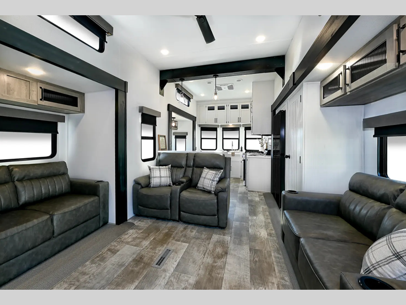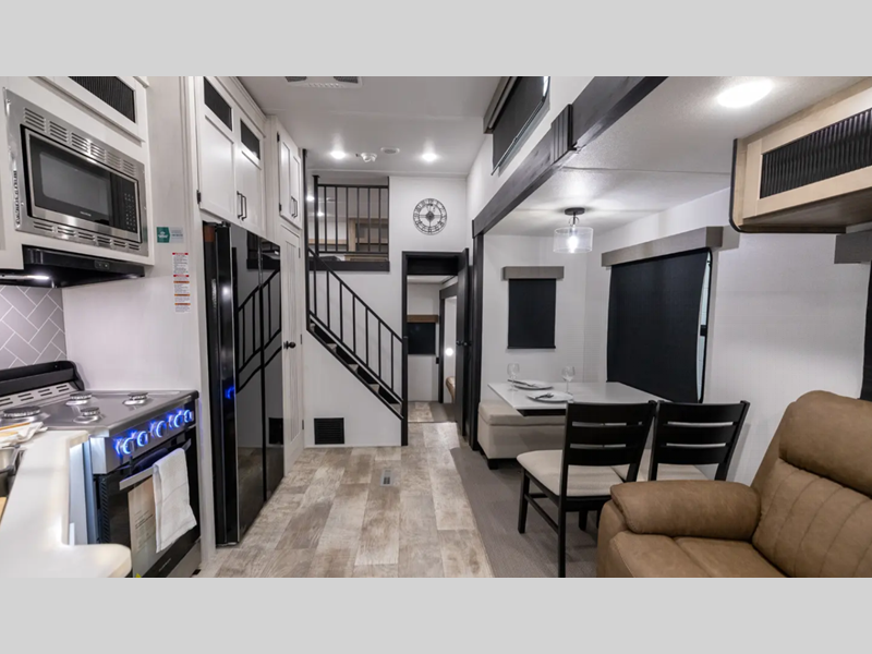 Sleeps 8 Length 35 ft 11 in Ext Width 8 ft 6 in Ext Height 13 ft 5 in Hitch Weight 1135 lbs GVWR 10623 lbs Dry Weight 8823 lbs Cargo Capacity 1800 lbs Fresh Water Capacity 43 gals Grey Water Capacity 70 gals Black Water Capacity 35 gals Available Beds King Refrigerator Type Residential Cooktop Burners 4 Shower Size 34" x 40" Number of Awnings 1 LP Tank Capacity 30 lbs Water Heater Type Tankless TV Info LR 50" TV Awning Info 17' Washer/Dryer Available Yes Number of LP Tanks 2 Shower Type Standard Electrical Service 50 amp Similar Floorplans