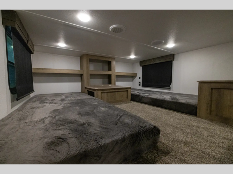 Sleeps 9 Slides 4 Length 42 ft 9 in Ext Width 8 ft Ext Height 11 ft 9 in Hitch Weight 1425 lbs GVWR 12654 lbs Dry Weight 10454 lbs Cargo Capacity 2200 lbs Fresh Water Capacity 43 gals Grey Water Capacity 70 gals Black Water Capacity 70 gals Number Of Bunks 3 Available Beds King Refrigerator Type Stainless Steel w/Ice Maker Refrigerator Size 18 cu ft Cooktop Burners 3 Shower Size 32" x 40" Number of Awnings 1 LP Tank Capacity 30 lbs Water Heater Capacity 12 gal Water Heater Type Gas/Electric DSI AC BTU 13500 btu Awning Info 21' Axle Count 2 Number of LP Tanks 2 Shower Type Shower w/Seat Electrical Service 50 amp Similar Floorplans